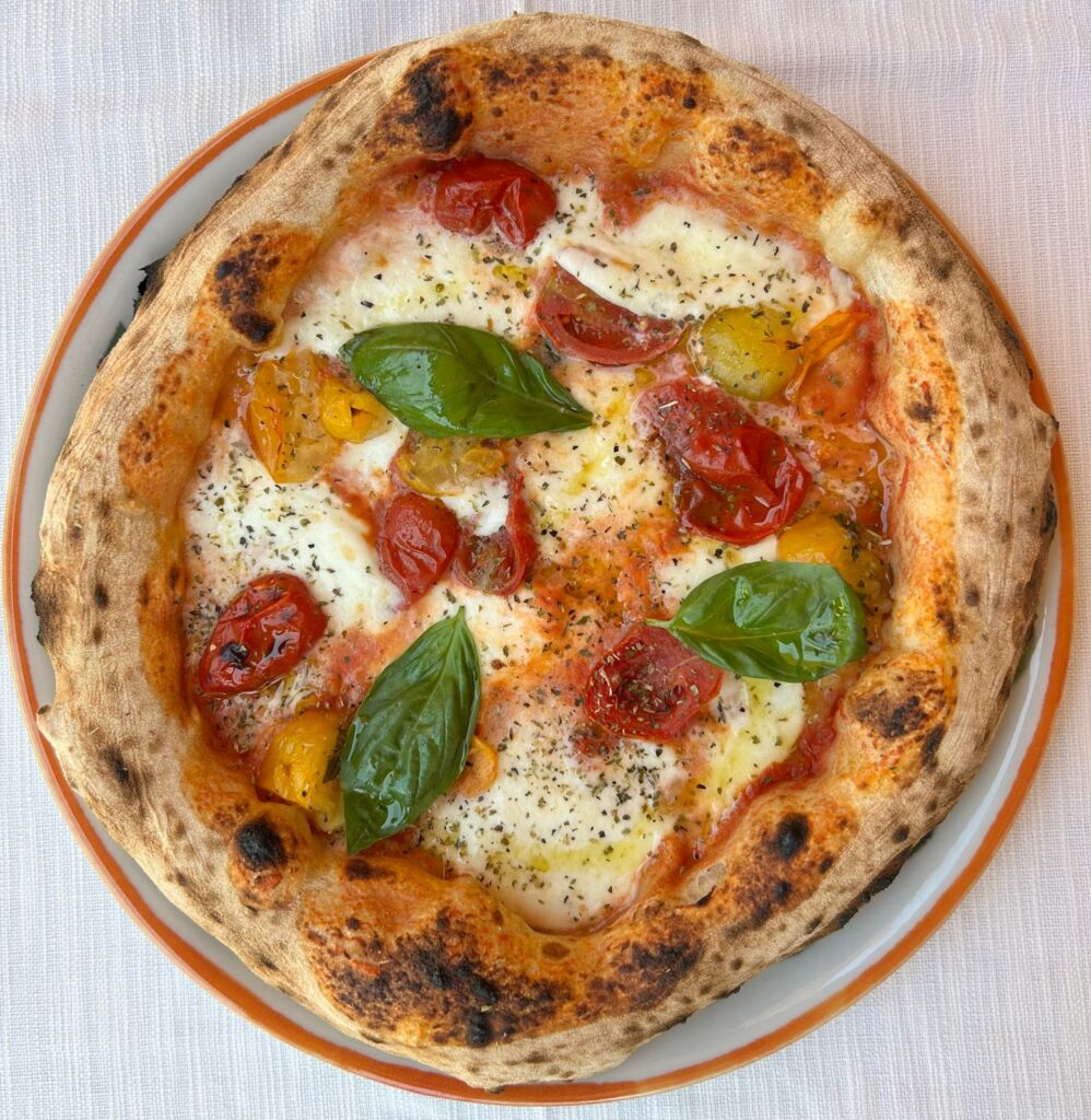 Pomodoro bio 100% italiano, mozzarella fior di latte, grana padano e pecorino romano, datterini rossi ripassati in padella, olio evo all’aglio, peperoncino e basilico