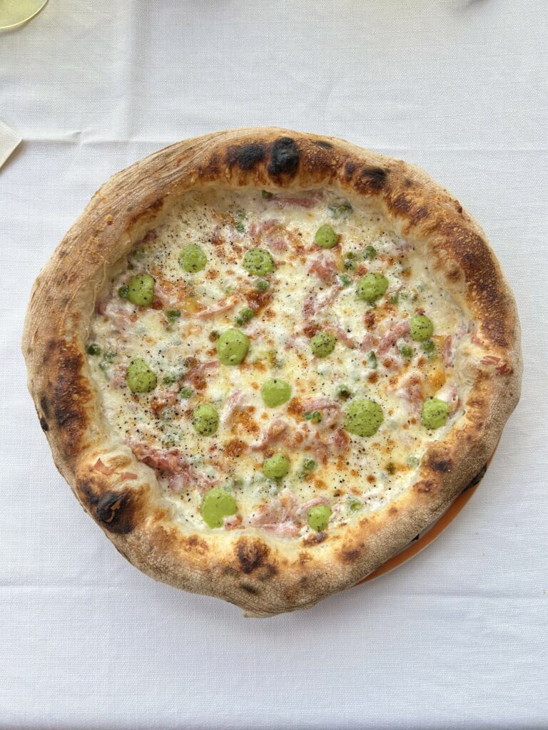 Mozzarella Fior di Latte, Prosciutto Cotto, panna fresca, piselli, grana padano grattugiato, crema di piselli, pepe al mulinello